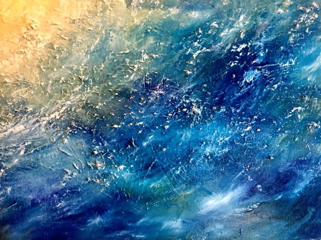 As an avid diver, Dina was inspired to capture the colors, emotions, and sensations of being immersed in the ocean. Above + Below explores not only the water, which Dina masterfully portrays, but also references the plants and animals that exist in this delicate ecosystem. Coral was a particular focus for Dina as she began studying the dying reefs and the sad state of our oceans as a result of human intrusion. As the series name suggests, each work takes on a different perspective, some capturing the feeling of being below the surface of the water and looking up at the sun, others taken as if from a bird's eye view above, inspired by plane rides over the Pacific Islands. One consistent element regardless of the work's perspective is the presence of light. Conscious of religious and philosophical rhetorics regarding the notion of light, Dina infused each painting with the presence of a light source, and the emotion of striving to "swim towards the light". Ultimately, each work in Above + Below is a study of the color blue - all the intricate shades and the varying emotional responses each one conveys. For Dina, the experience of diving is the feeling of total extraction from any worldly troubles or concerns, surrounded only by the refracted light, and a million shades of blue.